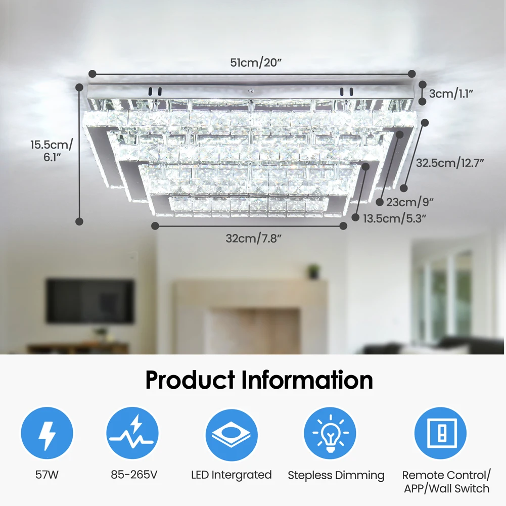 20.07” Indoor K9 Crystal LED Square Ceiling Light Fixture 3-Tier Rectangular Flush Mounted Chandelier Cool White Switch